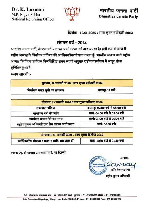 BREAKING : बीजेपी अध्यक्ष पद के चुनाव का नोटिफिकेशन जारी, 20 जनवरी को होगा चुनाव